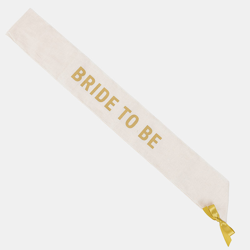 Confeccionada en suave algodón blanco, esta banda para despedida de soltera con la frase «BRIDE TO BE» en dorado metalizado brillante y se sujeta con una cinta dorada de satén.