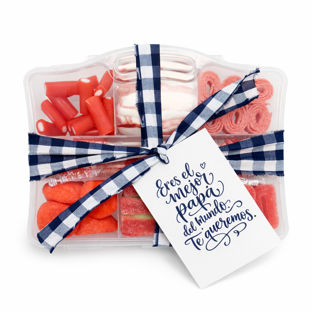 Buscas un regalo original para tu Padre esta maleta de chuches rojas es perfecta. Lleva una cinta de tela rasgada en vichy azul marino y una bonita tarjeta con un mensaje de mejor papá del mundo.