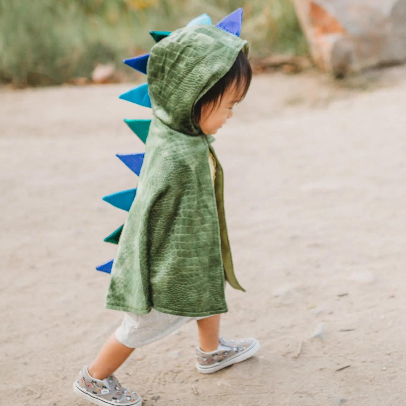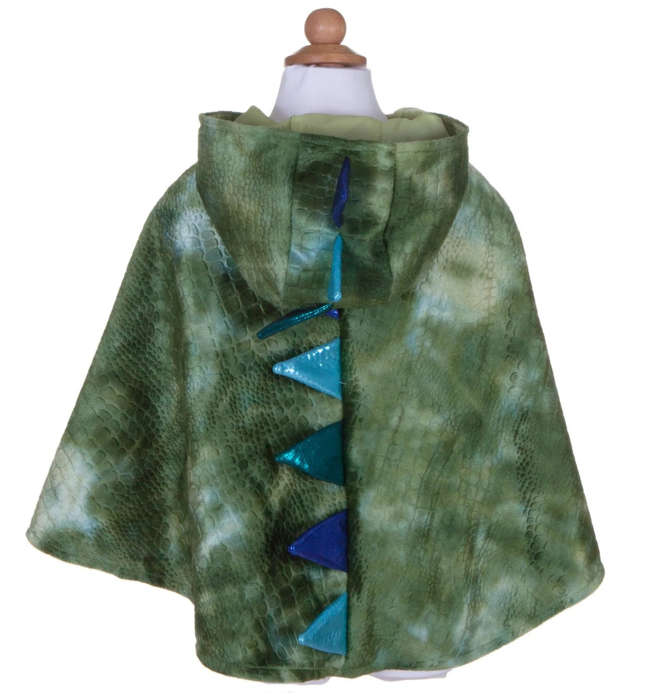 Capa de dragón en color verde brillante con efecto de escama con puntas en color azul. Perfecta para un disfraz este carnaval. Se cierra con un velcro en el cuello para mayor sujeción. Fabricada con tela de gran calidad, para que resista un millón de aventuras.