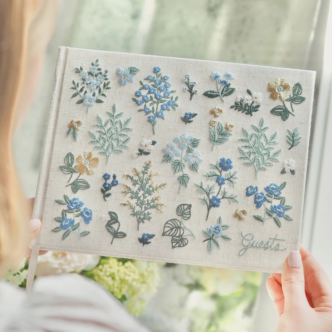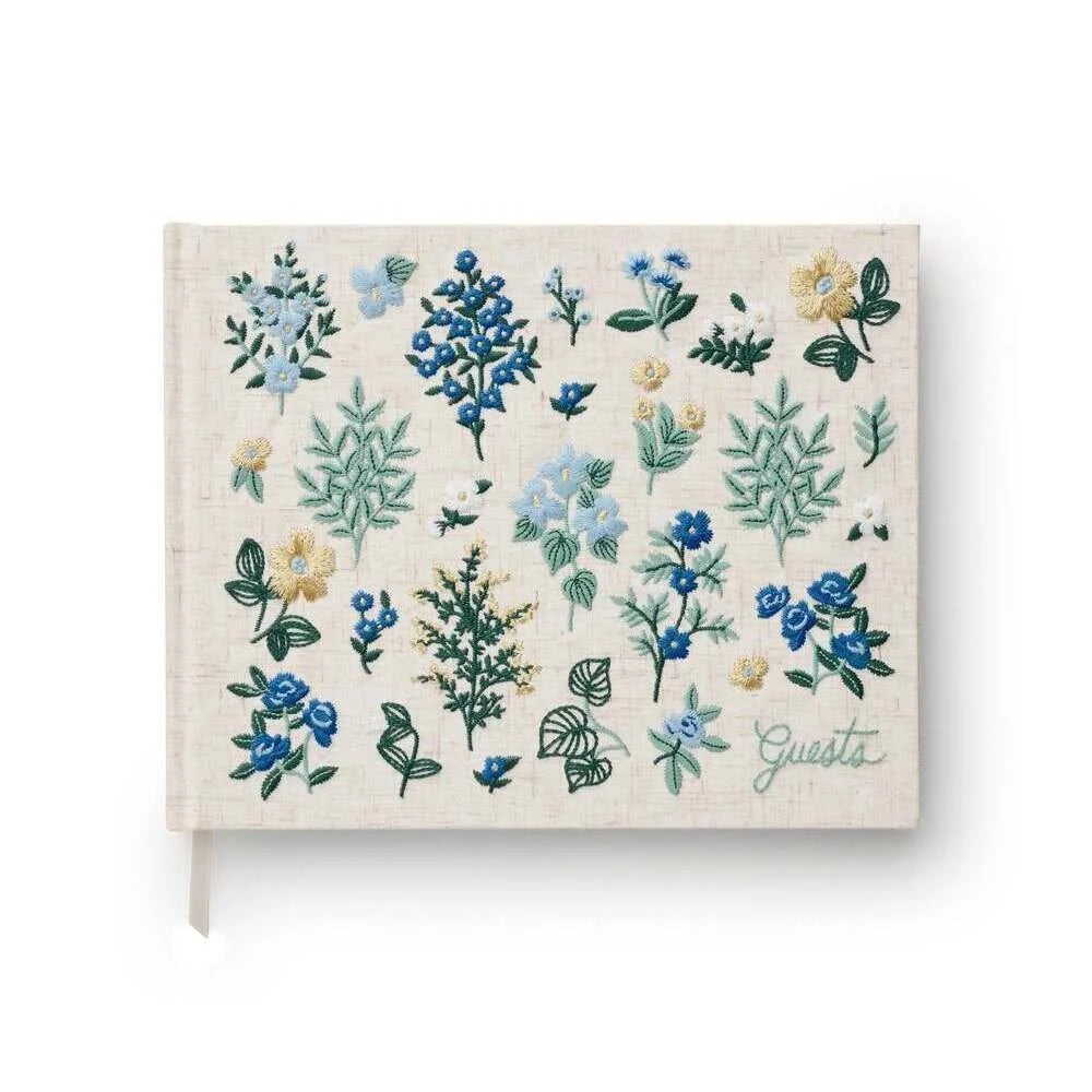 Este libro de visitas de Rifle Paper Co se presenta en una edición de lujo, en tapa dura, con cubierta de tela bordada y motivos florales.