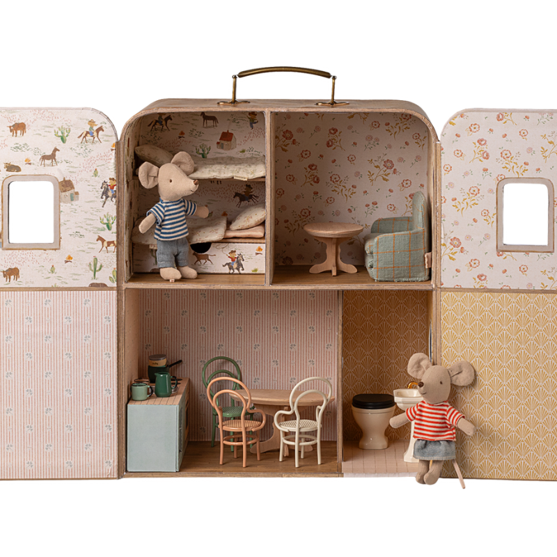 Bienvenido a SuitCasa, una pequeña casa portátil. Es ideal para los ratones pequeños. Incluye dos juegos de ropa de cama suave para tus amigos, pero puedes comprar otros muebles pequeños para decorar la casa.