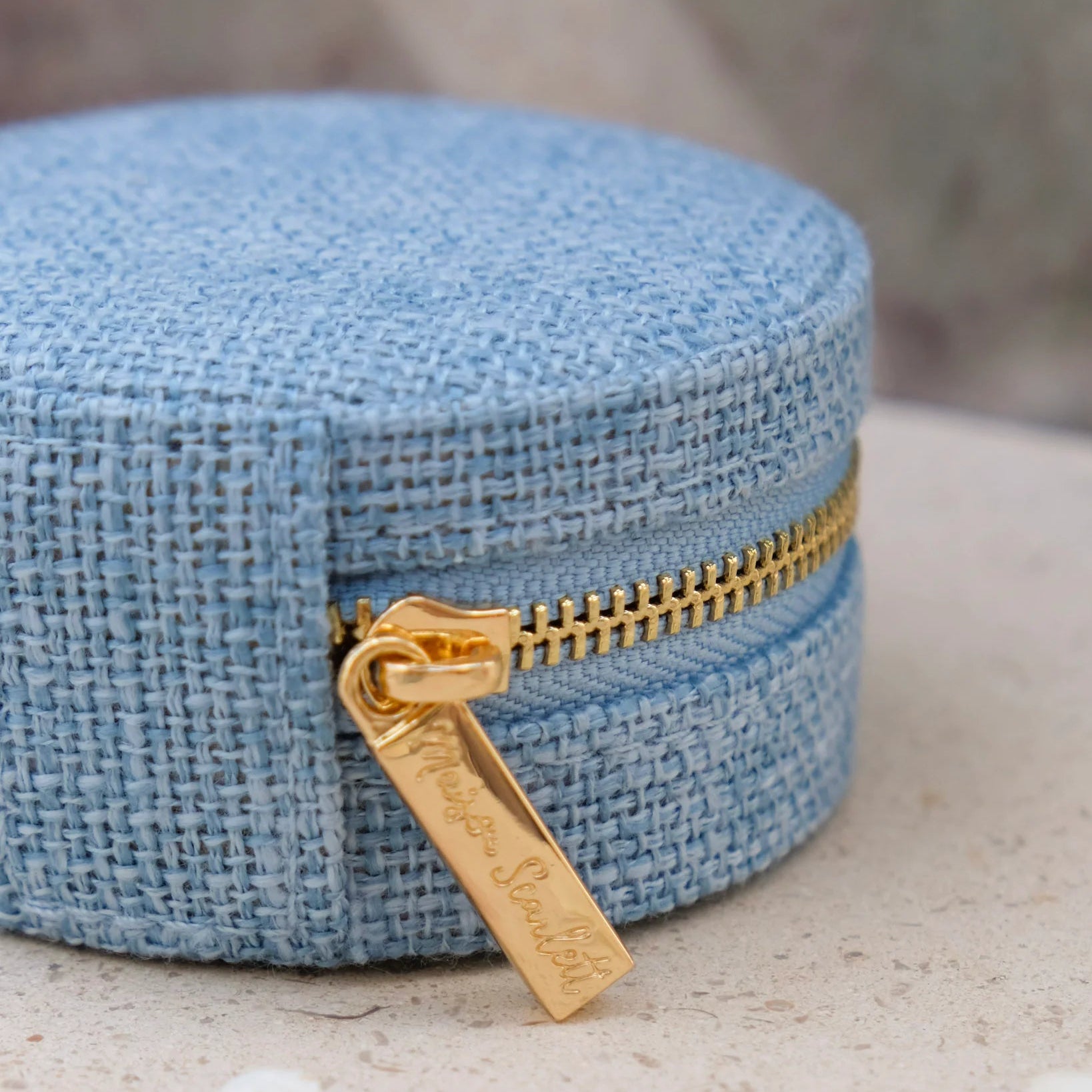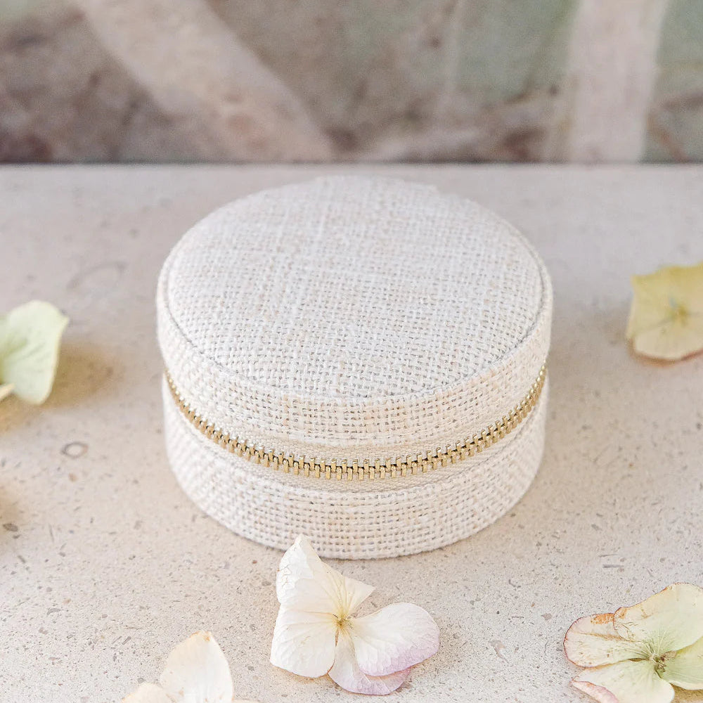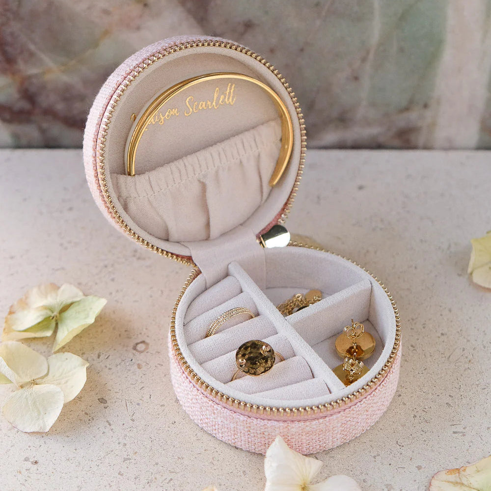 Yvone, es un elegante joyero mediano o de viaje de gran calidad. Es el regalo perfecto y su tamaño compacto lo hace fácil de llevar a todas partes. Su textura efecto lino y cremallera de acero dorado con el logo de Maison Scarlett grabado para mayor elegancia.