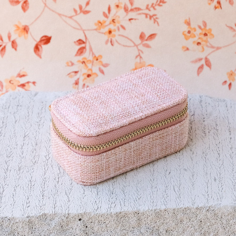 Marie, es un elegante joyero pequeño o de viaje de gran calidad. Es el regalo perfecto y su tamaño compacto lo hace fácil de llevar a todas partes. Su textura efecto lino y cremallera de acero dorado con el logo de Maison Scarlett grabado para mayor elegancia.