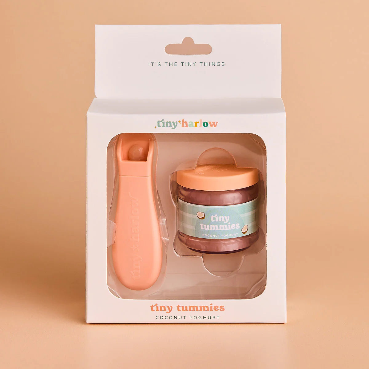 Este set se presenta en un bonito packaging individual y forma parte de la colección Tiny Tummies, disponible en distintos sabores: Coconut Yoghurt, Grape Jelly, Roast Chicken Dinner, Apple Purée, Banana Custard, Chocolate Custard, Strawberry Custard y Peach Jelly.