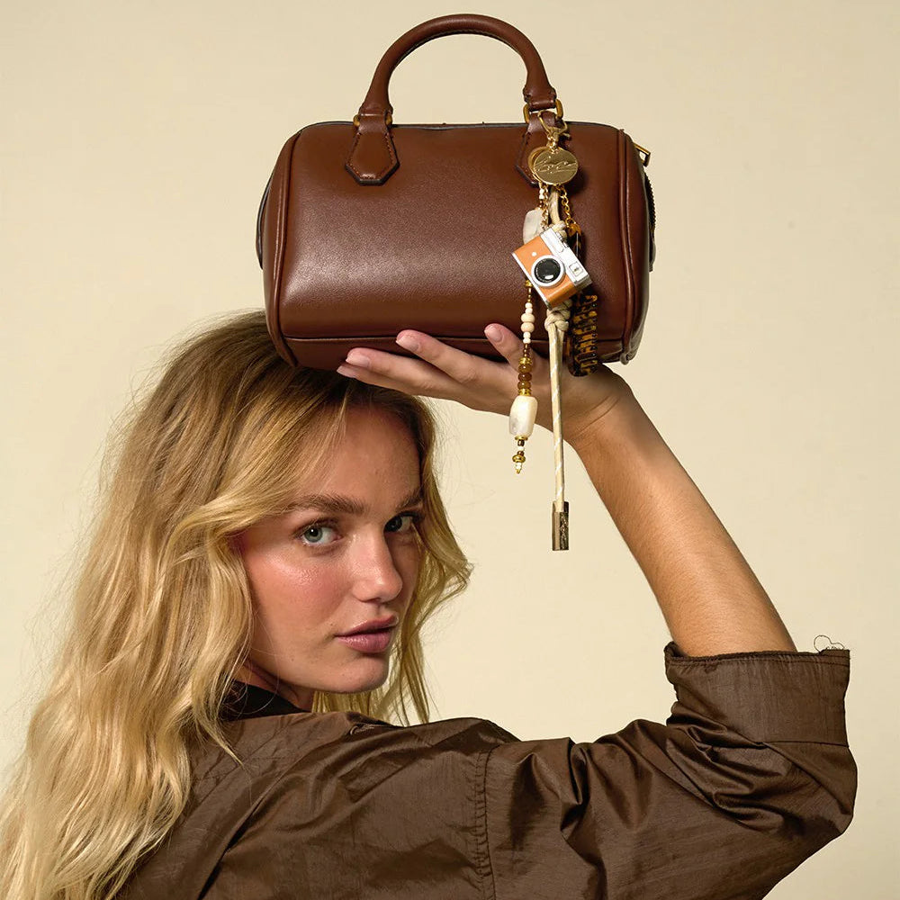 Nuestro Charm para bolso Bobby le da un toque único a tus bolsos favoritos. Hecho con cuentas, un cordón anudado y delicados dijes, se engancha fácilmente a las asas para un look elegante, divertido y personalizable. Tiene una divertida máquina de fotos y un peine en acabado carey.