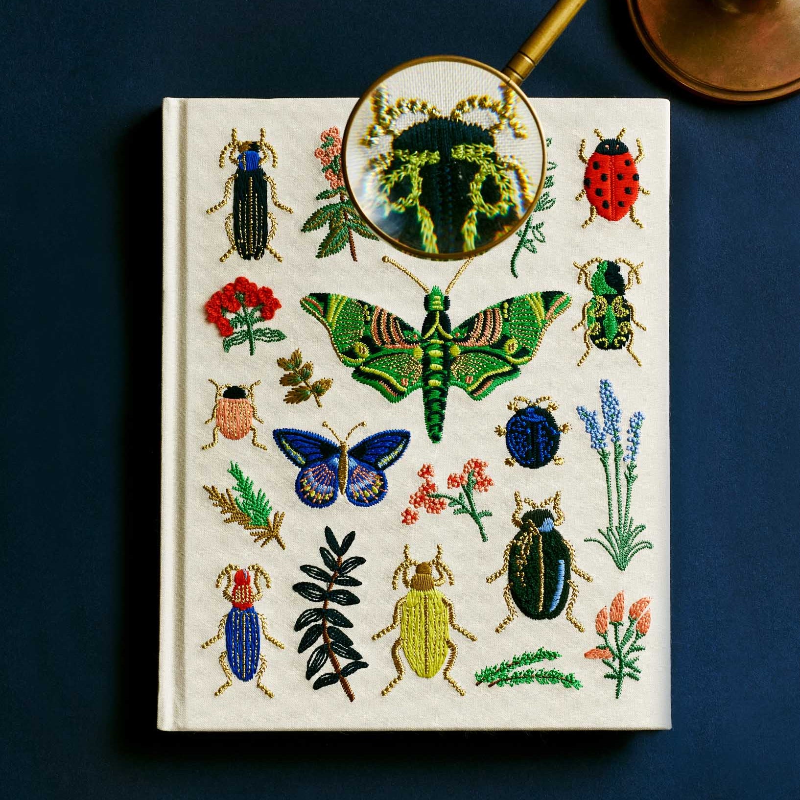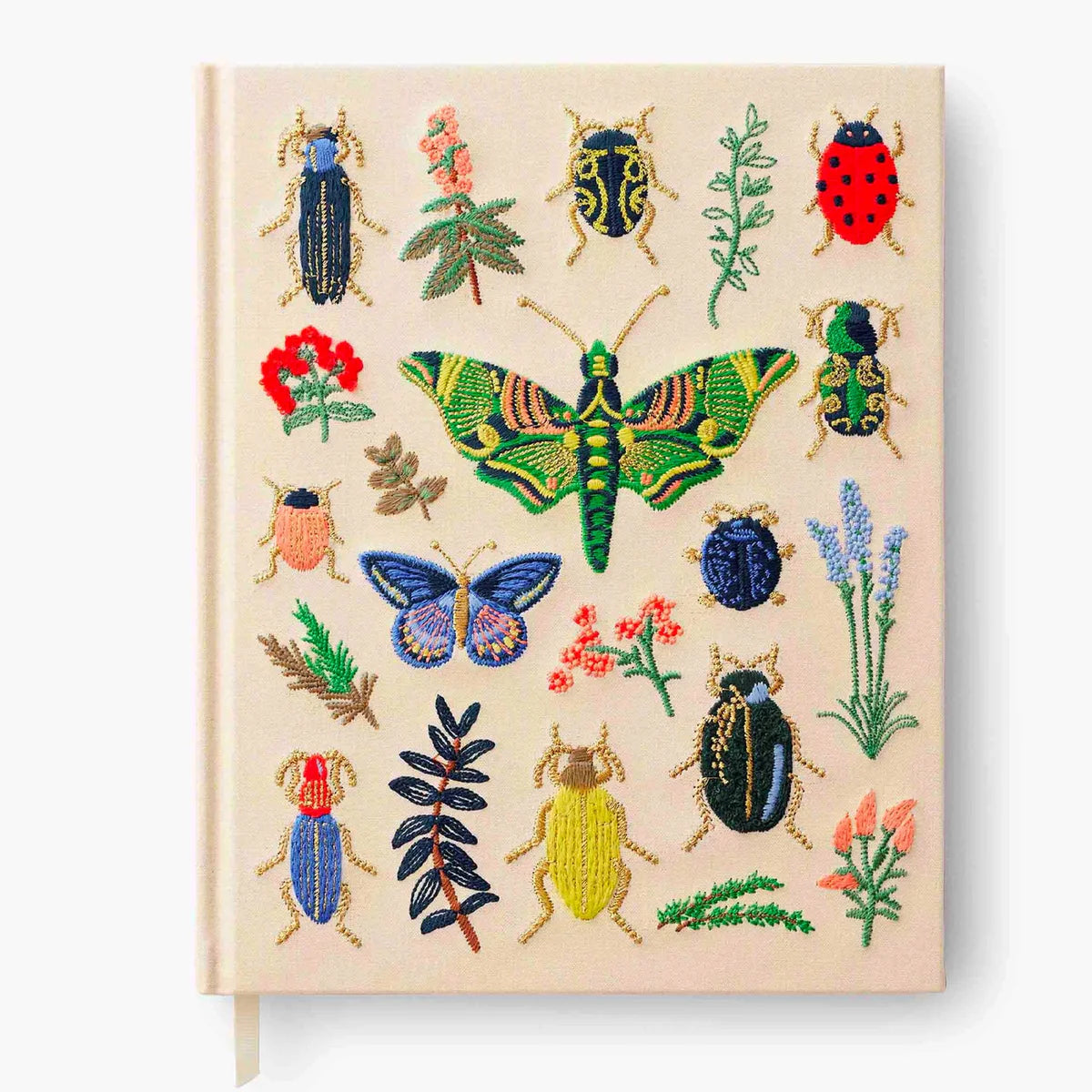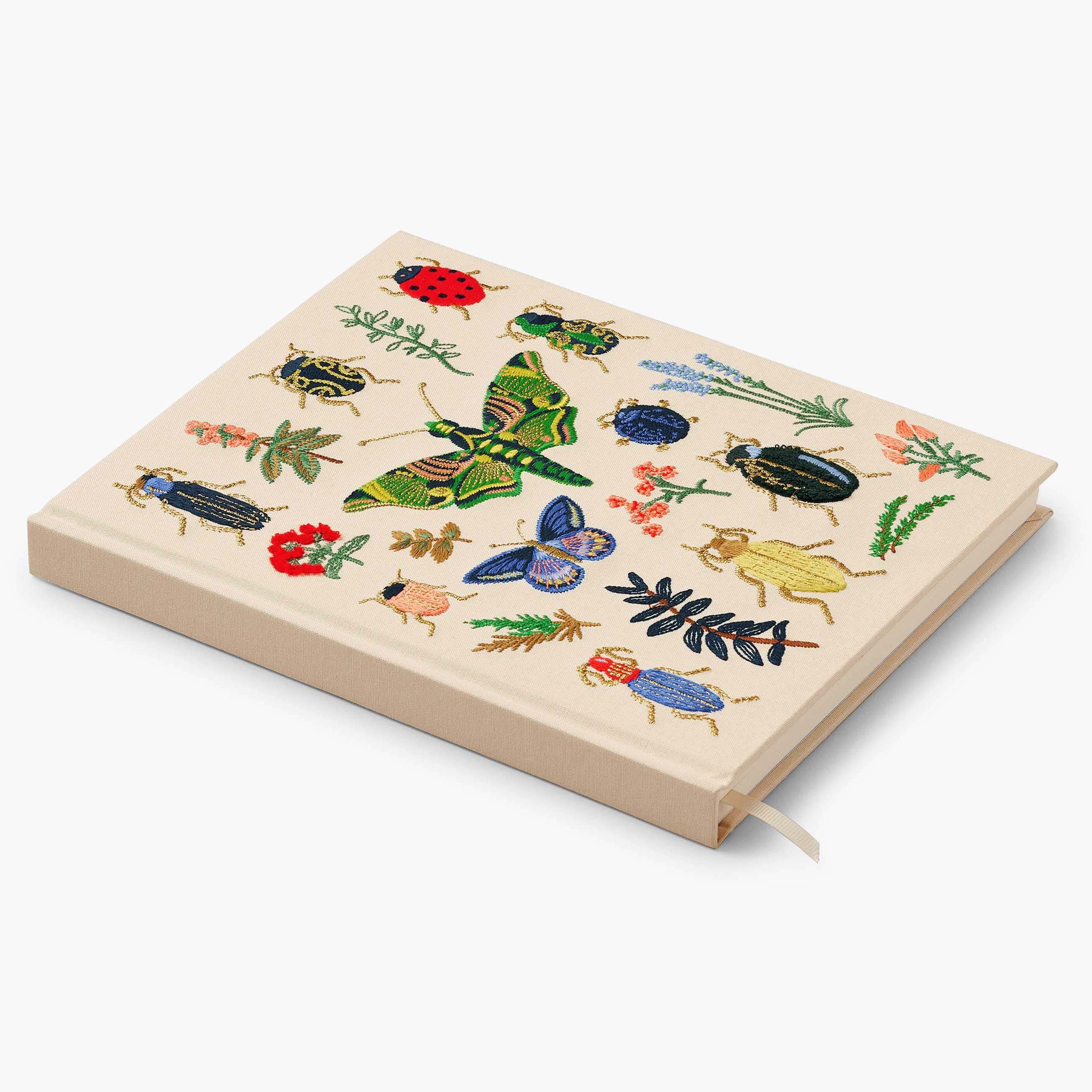 Nuestro cuaderno de bocetos bordado es un cuaderno grande de tapa dura con 108 páginas sin líneas de papel grueso, perfecto para dibujar, esbozar y escribir. La cubierta está forrada en tela color crema y bordada con los escarabajos e insectos de nuestra lámina Curio, con detalles en oro metalizado. Incluye un marcapáginas de cinta de grosgrain para que no te pierdas ninguna página.