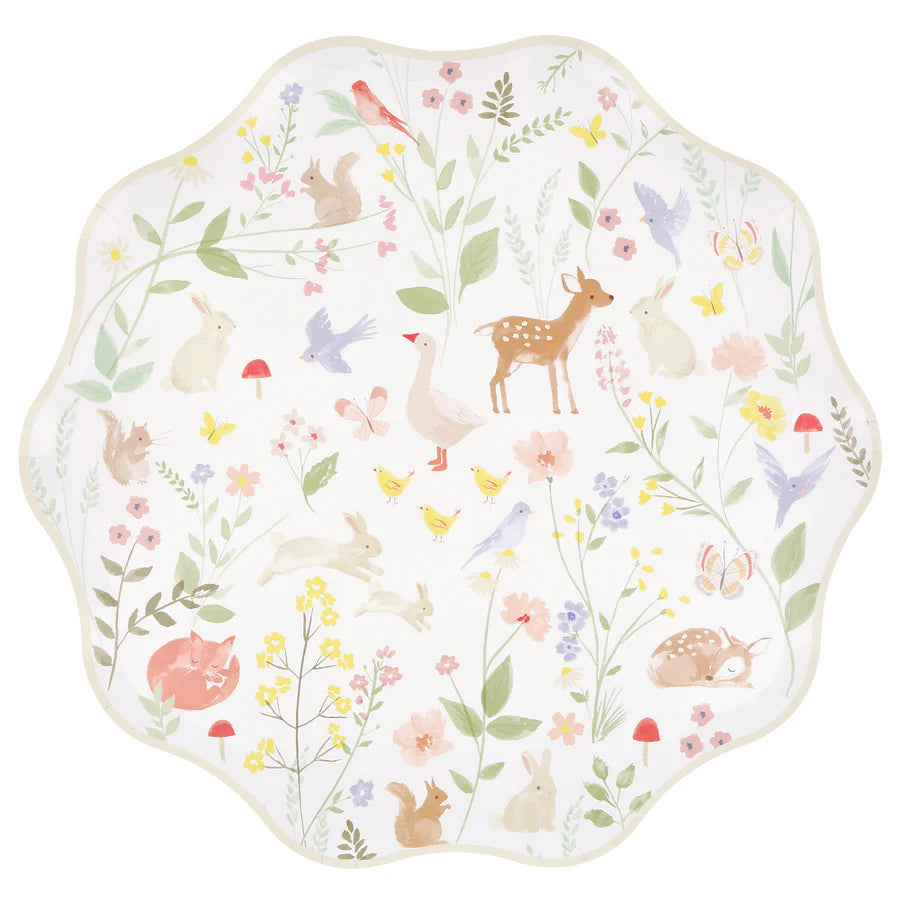 Nuestra colección Animalitos rebosa de encanto de cuento, inspirada en libros infantiles antiguos, animación de los años 40 y papel tapiz floral clásico. Estos platos grandes con animales de acuarela, como gansos y cervatillos, entre delicadas flores, para aportar una delicada belleza a tu mesa de fiesta. Los bordes ondulados aportan un toque original. Perfectas para cumpleaños infantiles o baby showers.