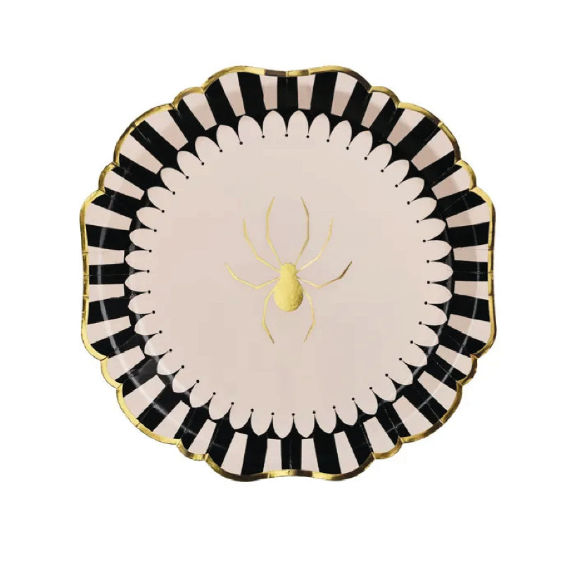 Elegant plates with a scalloped gold rim, stylish black stripes, and a glittery spider in the center are perfect for your Halloween party. With a very chic and elegant finish.