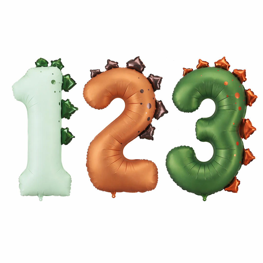 These new dinosaur-shaped number balloons will look great at your celebration or children's birthday party. Each number is a different color and resembles a dinosaur's spines. You can inflate them with helium to make them fly, or they also look great attached directly to a wall with double-sided tape.