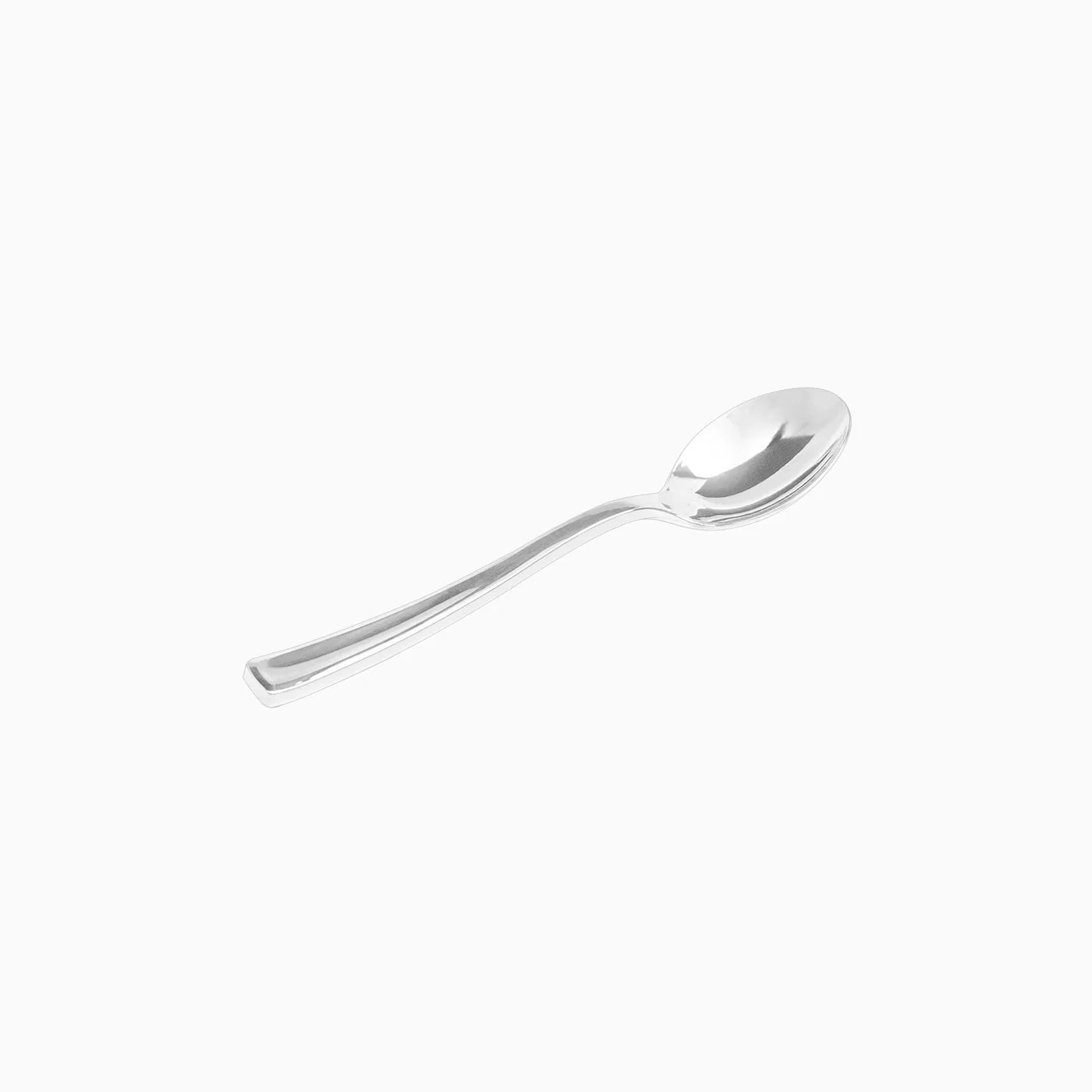 Cucharita de postrede 13 cm de plástico reutilizable en color plata. Con acabado de brillo, gracias a su mayor calidad son más rígidas, elegantes y resistentes.