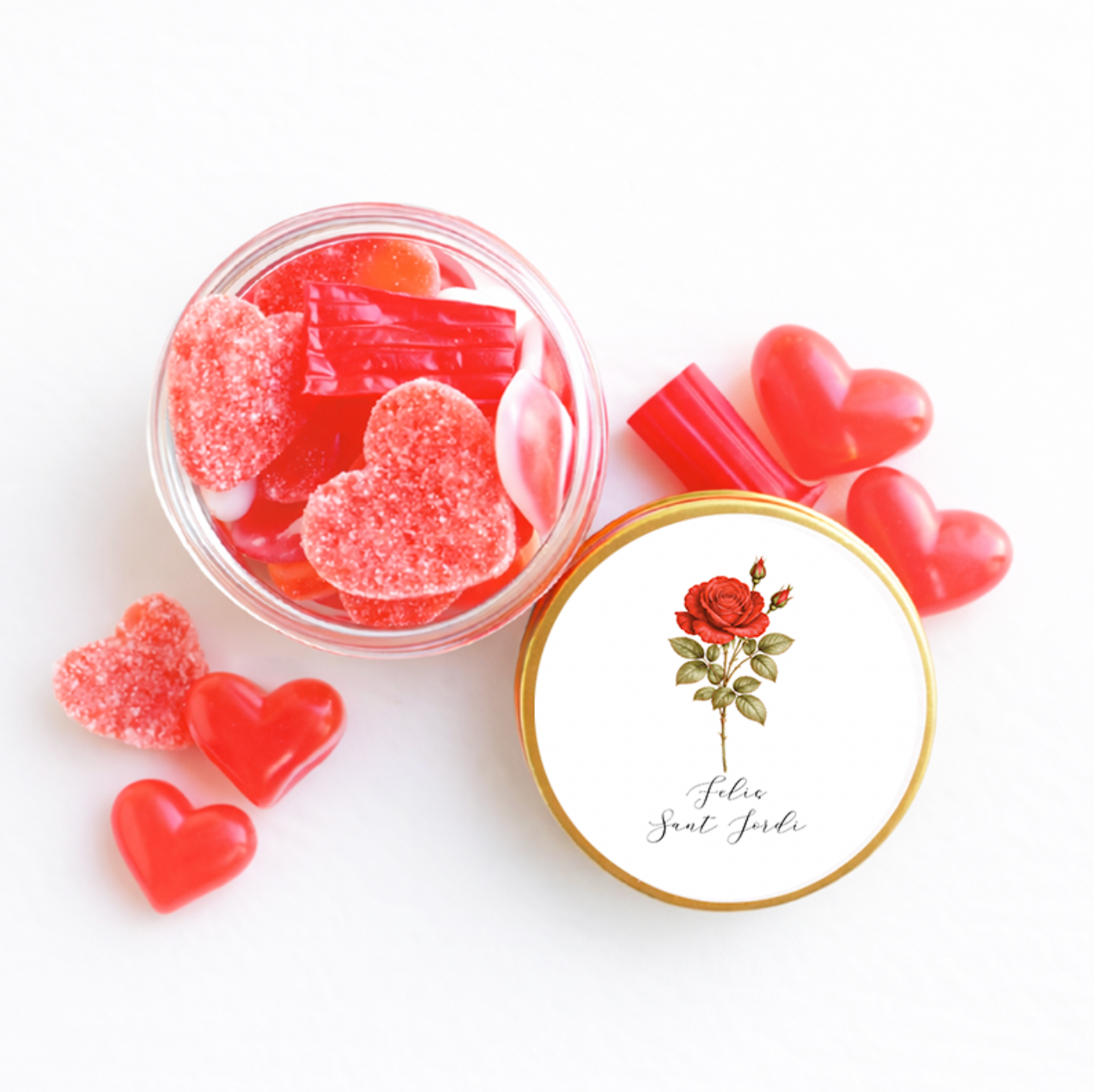 Each thick plastic jar has a gold aluminum lid with a love letter-shaped label filled with the best quality sweets made in Spain.