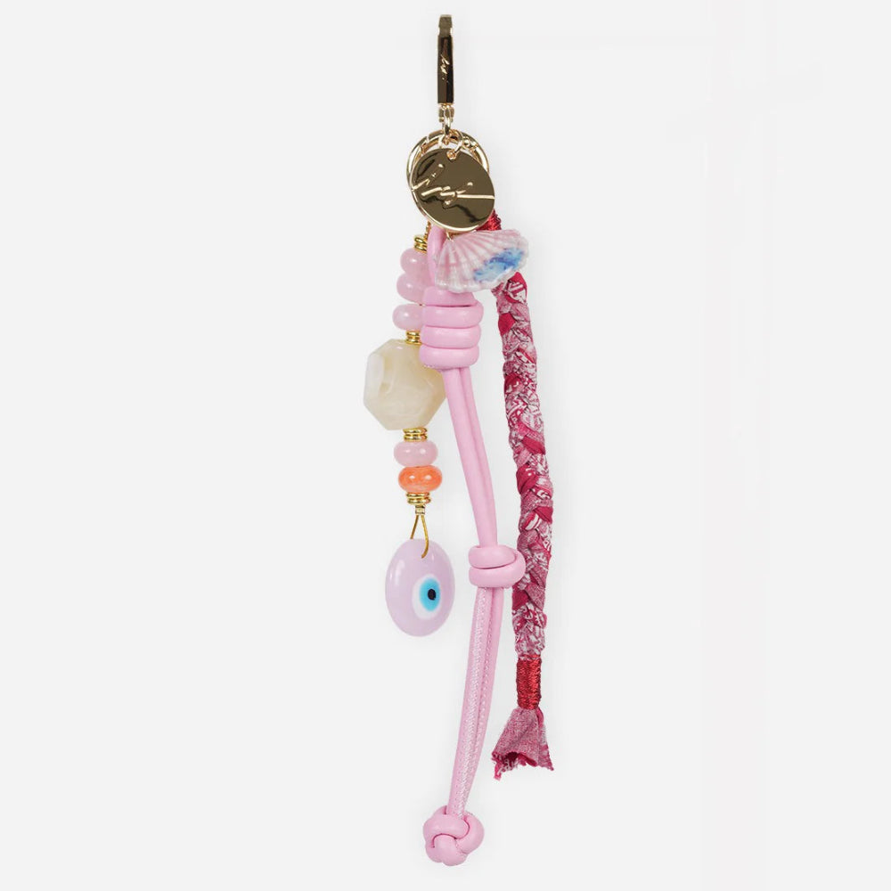 Our Bobby bag charm adds a unique touch to your favorite bags. Made with beads, a knotted cord, and delicate charms, it easily clips onto handles for a chic, fun, and customizable look.