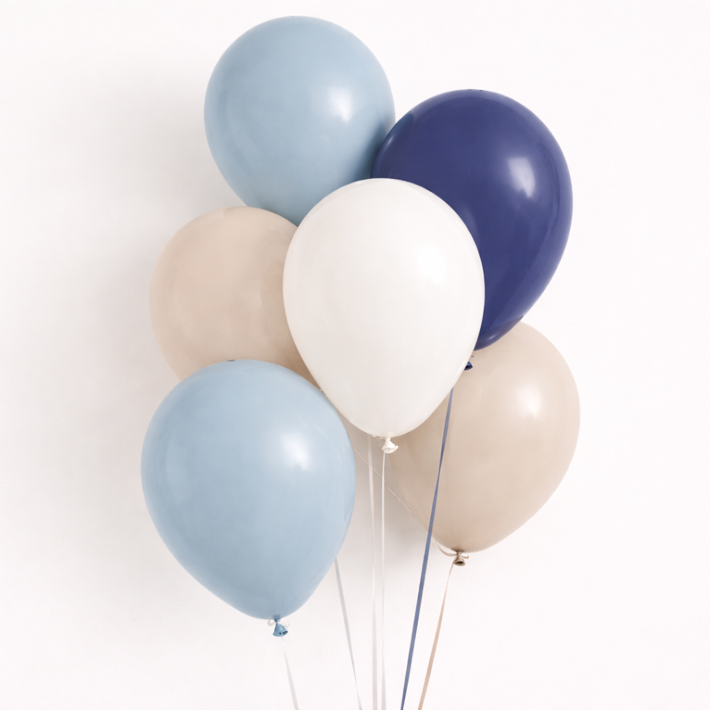 This mix is one of our favorite color combinations that we usually combine at our events . Latex balloons in powder colors in night blue, powder blue, stone and bone with a matte pastel finish that is a trend at parties.