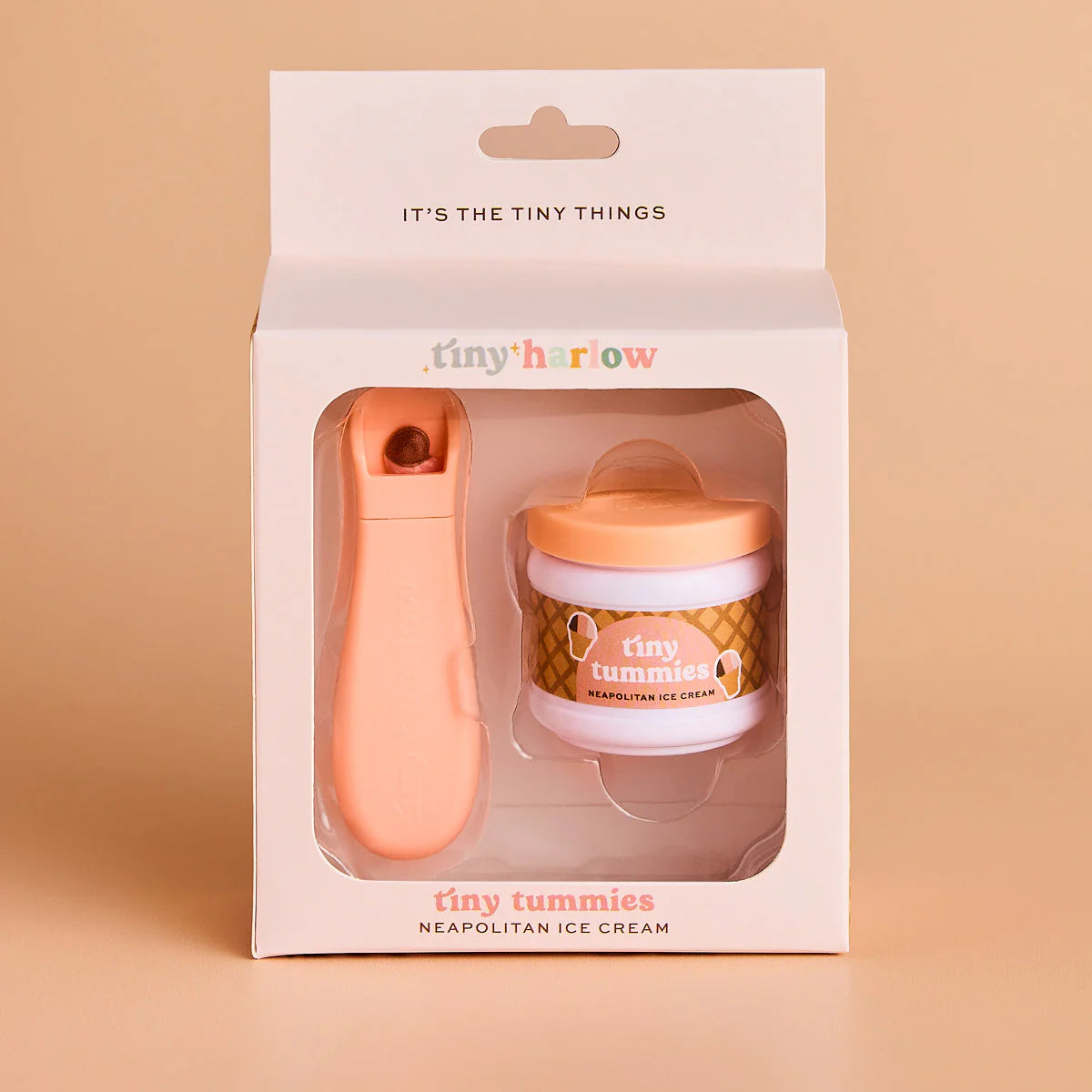Este set se presenta en un bonito packaging individual y forma parte de la colección Tiny Tummies, disponible en distintos sabores: Coconut Yoghurt, Grape Jelly, Roast Chicken Dinner, Apple Purée, Banana Custard, Chocolate Custard, Strawberry Custard y Peach Jelly.