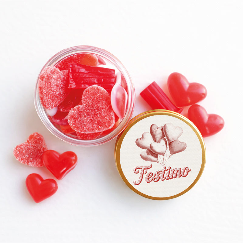 Cada bote de plástico grueso tiene una tapa de aluminio dorado con etiqueta "T'Estimu" rellenos de golosina de la mejor calidad fabricadas en España.