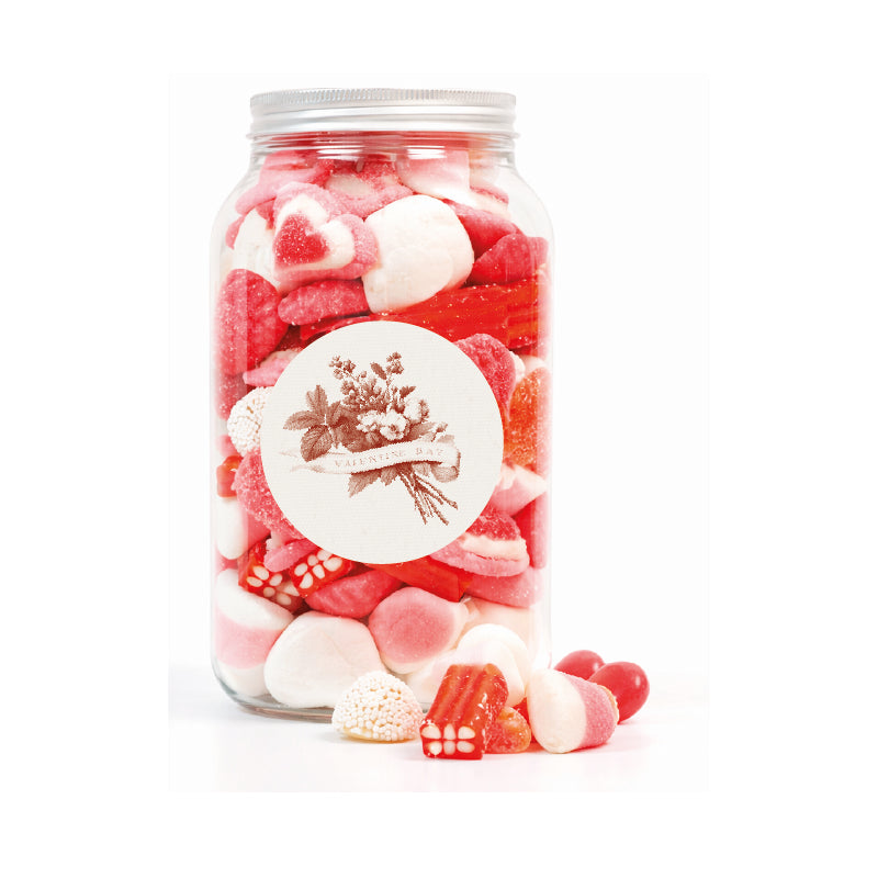 Recibirás un espectacular bote con pegatina y capacidad 1,25 lts. de plástico grueso brillo con tapa de aluminio repleto de nubes, corazones y besitos en colores rojo y rosa.