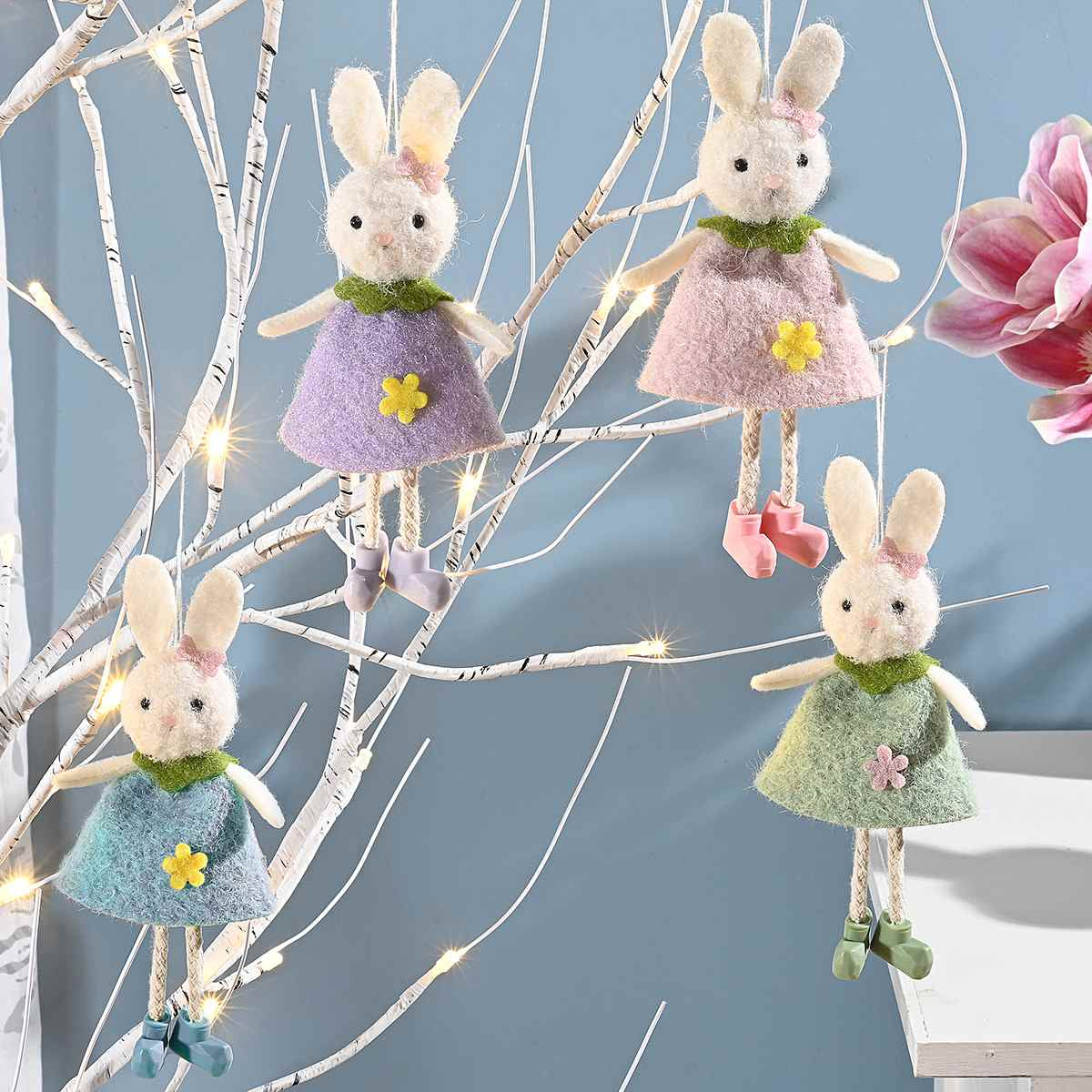 Adorables conejitas con vestido de fieltro en unos colores adorables. Son perfectas para un detalle de pascua para las más pequeñas de casa y así hacer un regalo muy especial o para colgar de tu palma.