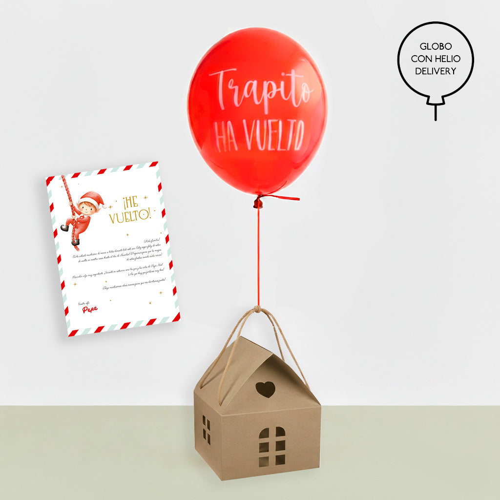 This box comes directly from the North Pole, with a beautiful red balloon flying, 50 cm . A handwritten "I'm back" letter personalized with your elf's name. The kraft-colored house-shaped box symbolizes your elf's arrival home.