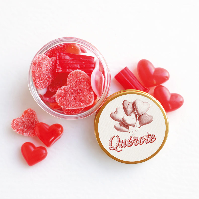 Cada bote de plástico grueso tiene una tapa de aluminio dorado con etiqueta "Quérote" rellenos de golosina de la mejor calidad fabricadas en España.