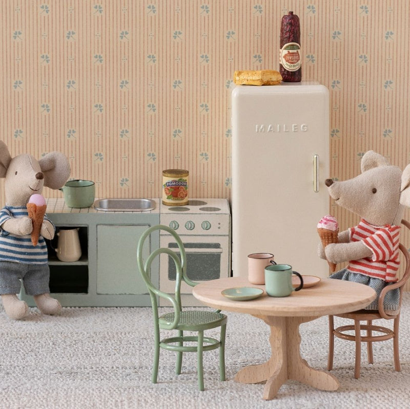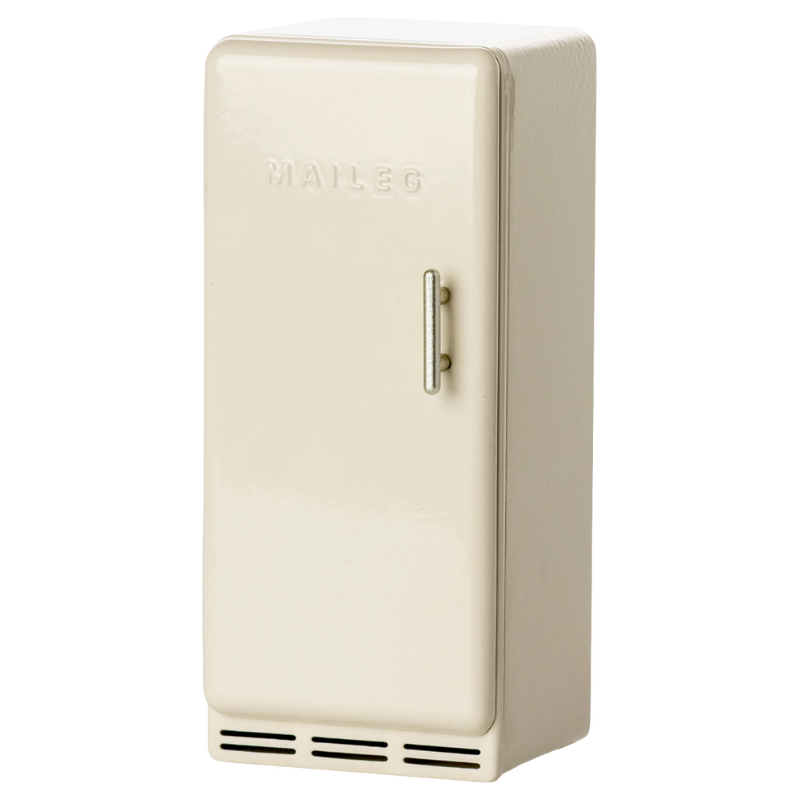 Un frigorífico antiguo que encaja perfectamente en la granja Maileg Mouse Hole Farmhouse. Dentro del frigorífico encontrarás un pequeño queso, salchichas y algunos helados. Contaremos más cuentos y alargamos el juego.