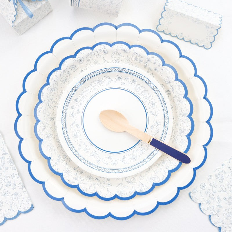 Elegante plato de cartón tamaño fondo con borde festonado en color azul y flores a juego. Un básico para tu mesa de bautizo o comunión.