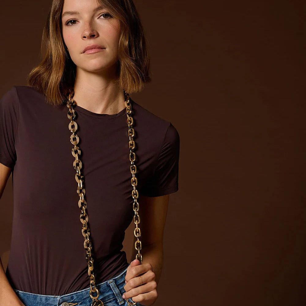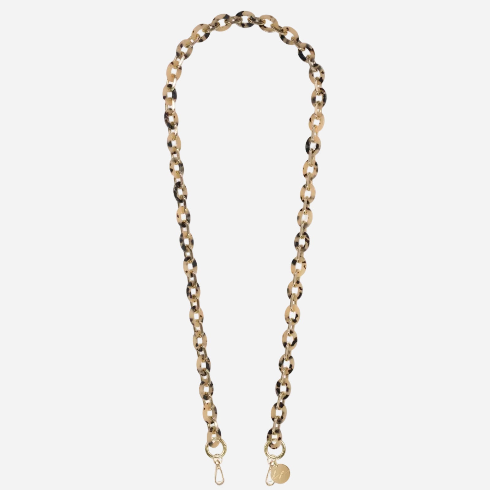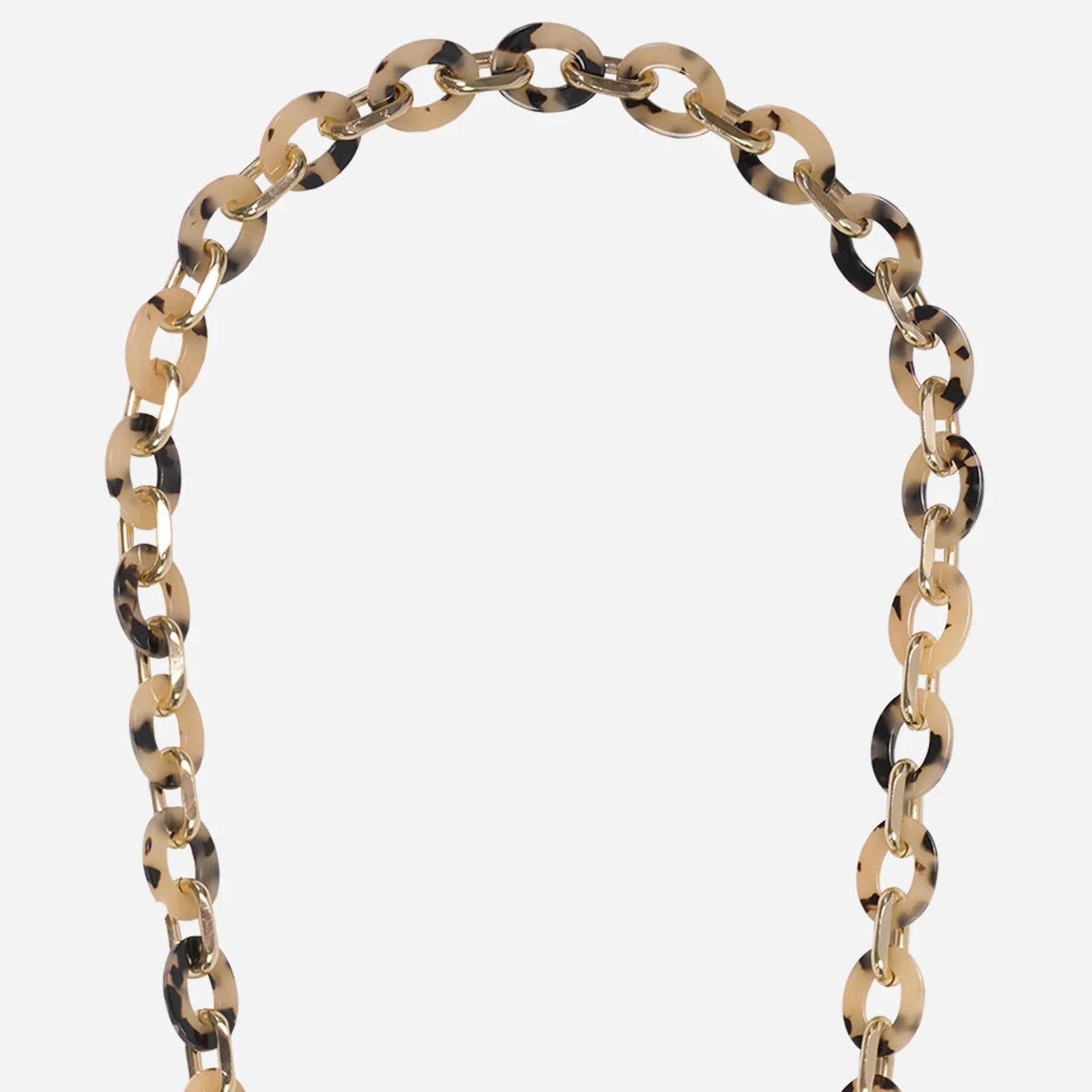 La cadena para teléfono Cassy reinventa la clásica cadena en una versión más atrevida. Su combinación de resina y metal dorado añade volumen y un toque de alta costura para una pieza robusta, contundente y fácil de llevar.