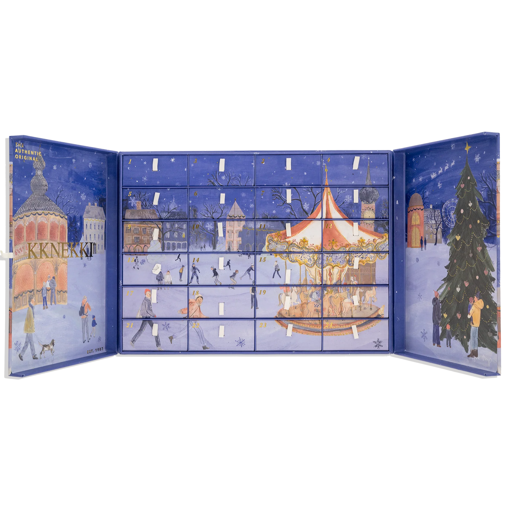 Tal como a família Bon Dep, Signe guarda boas recordações das suas visitas de infância a Tivoli, famoso pelo seu charme nostálgico, atmosfera de inverno escandinava e mercados de Natal mágicos. O calendário deste ano capta esse mesmo espírito, com um céu azul-escuro profundo, luzes cintilantes e o aroma dos pinheiros no ar fresco do inverno.
