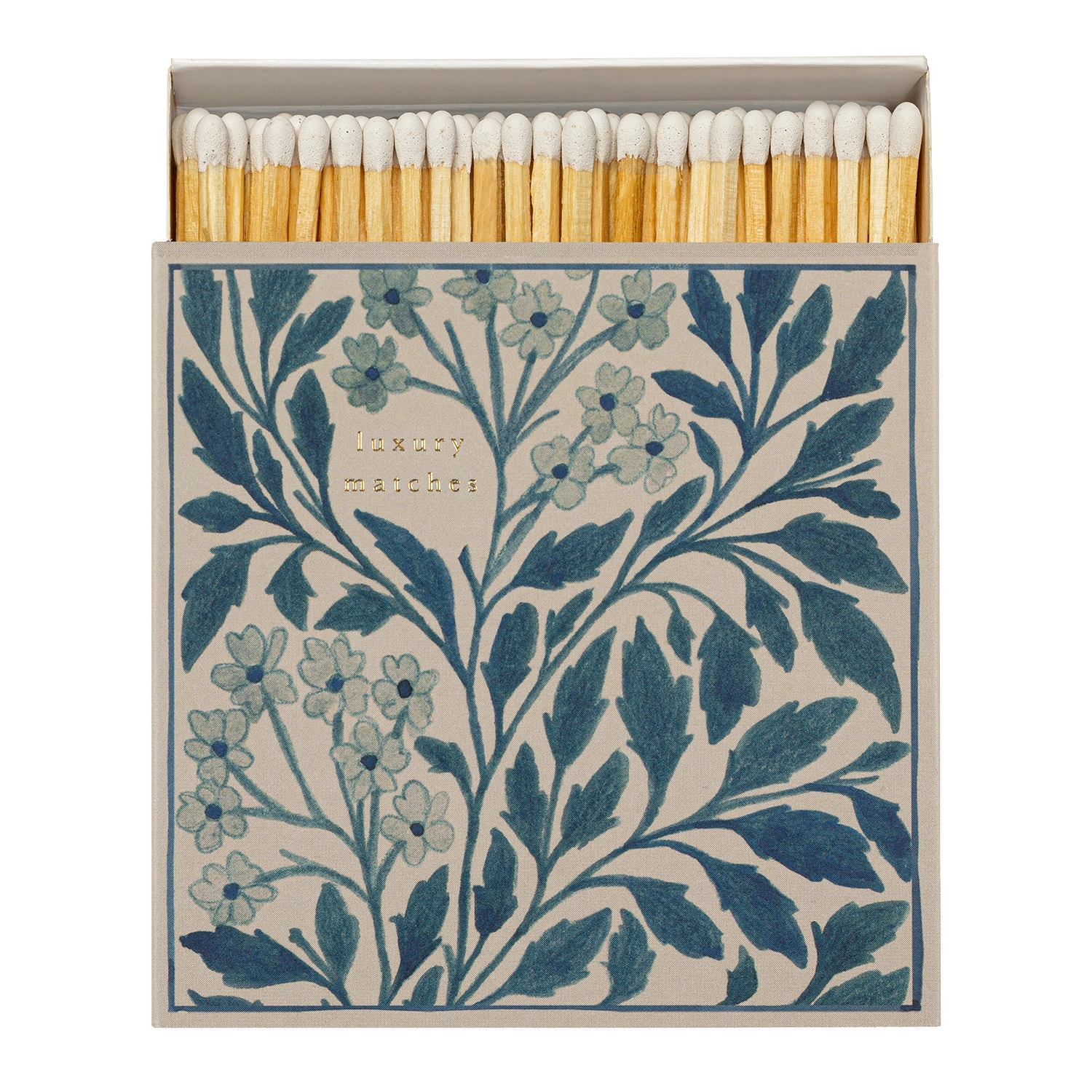 A nossa icónica caixa de fósforos quadrada apresenta um bonito design botânico azul de folhas e flores, e as palavras “Fósforos de Luxo” em dourado.