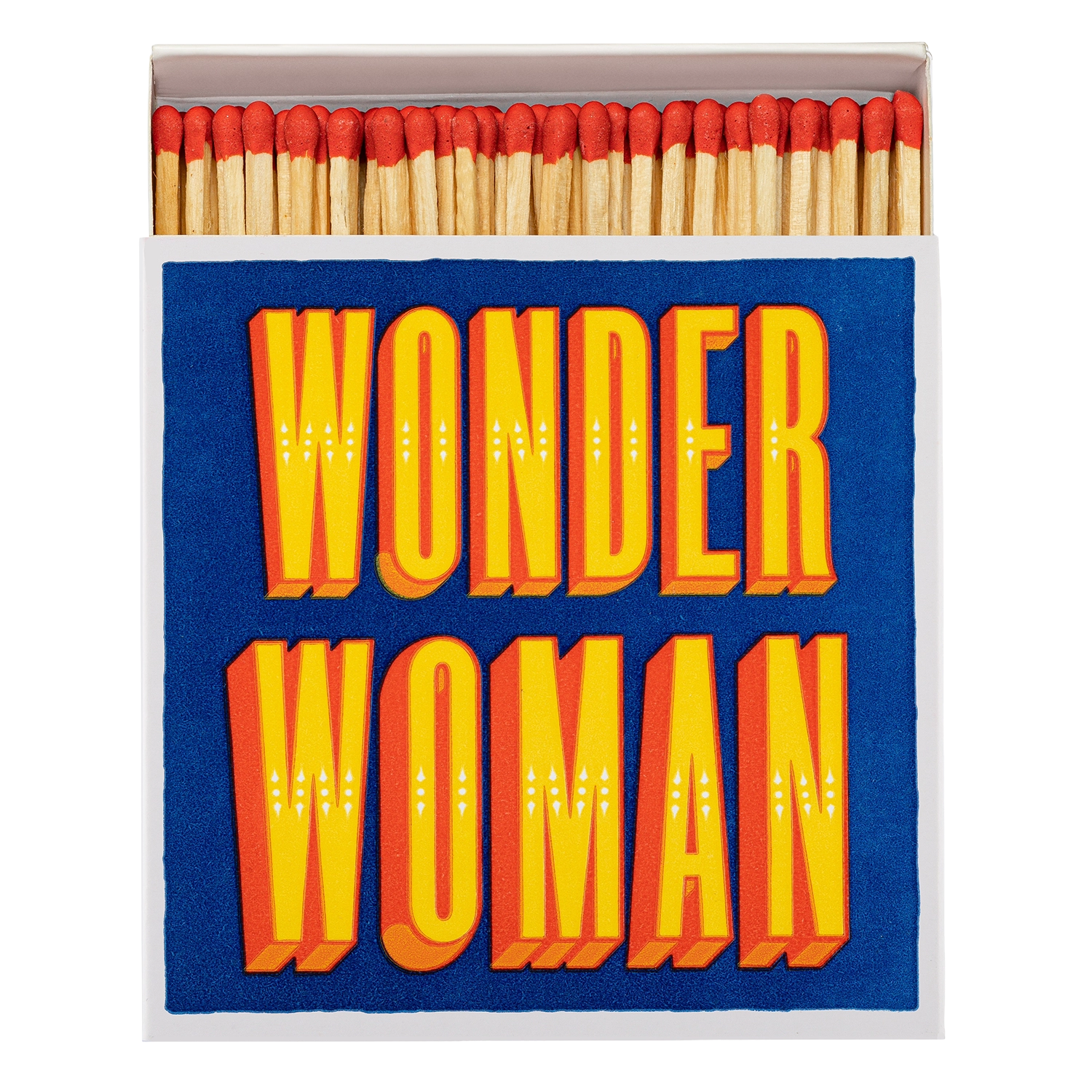 A nossa icónica caixa de fósforos quadrada com as palavras “Mulher-Maravilha” em amarelo e laranja negrito sobre um fundo azul escuro.