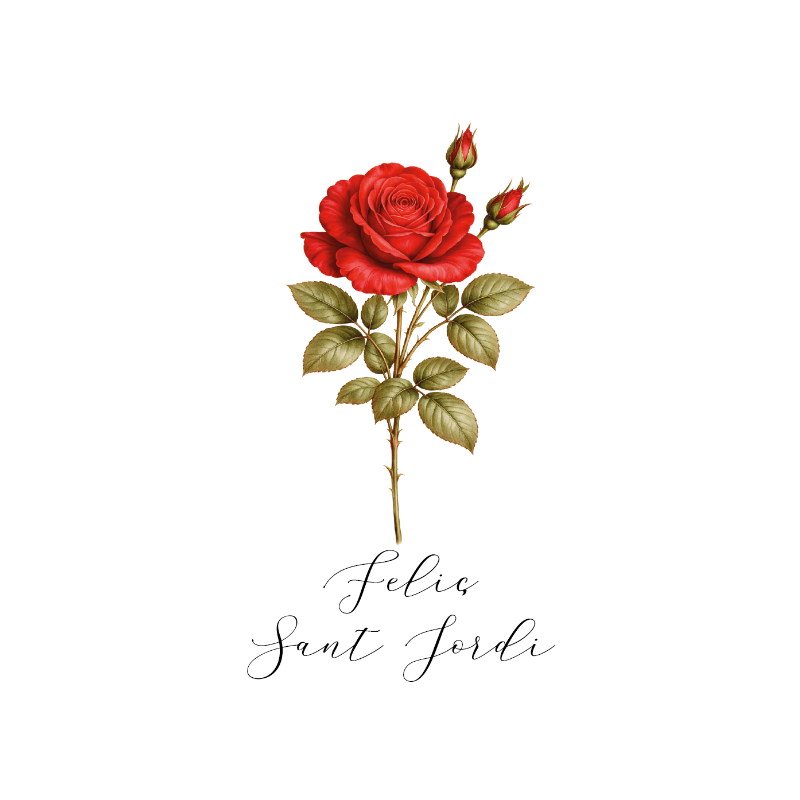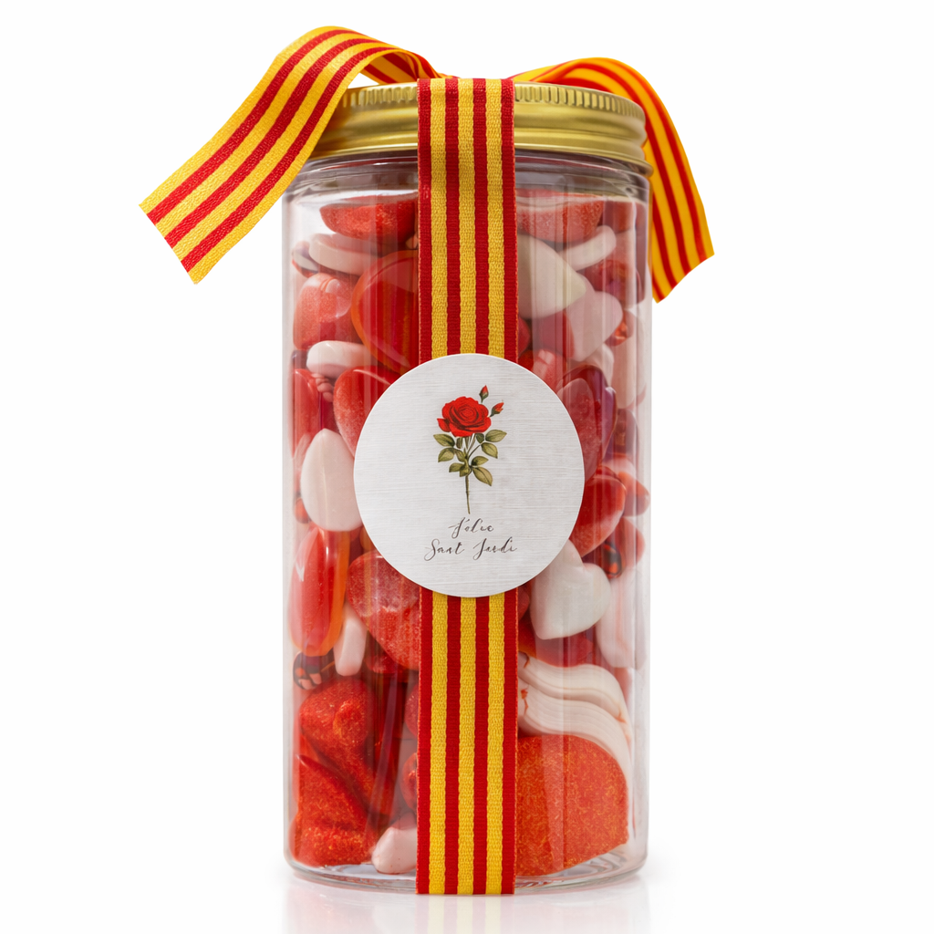 Espectacular bote de golosina roja decorado con nuestra exclusiva etiqueta Sant Jordi 2026 y una cinta ideal con la Senyera Catalana.