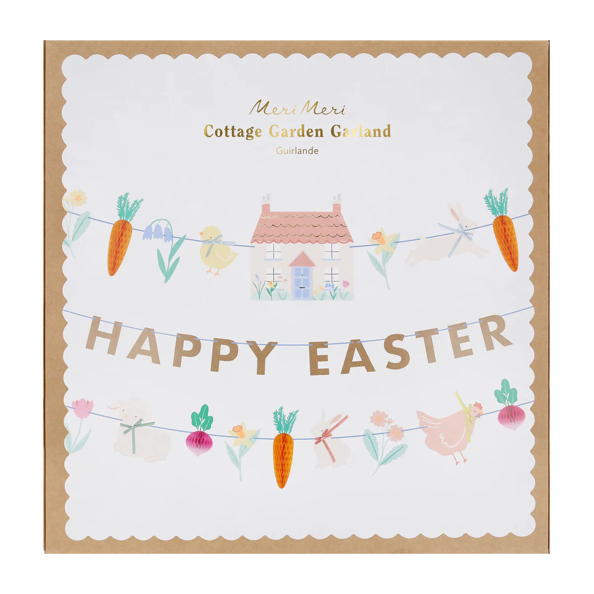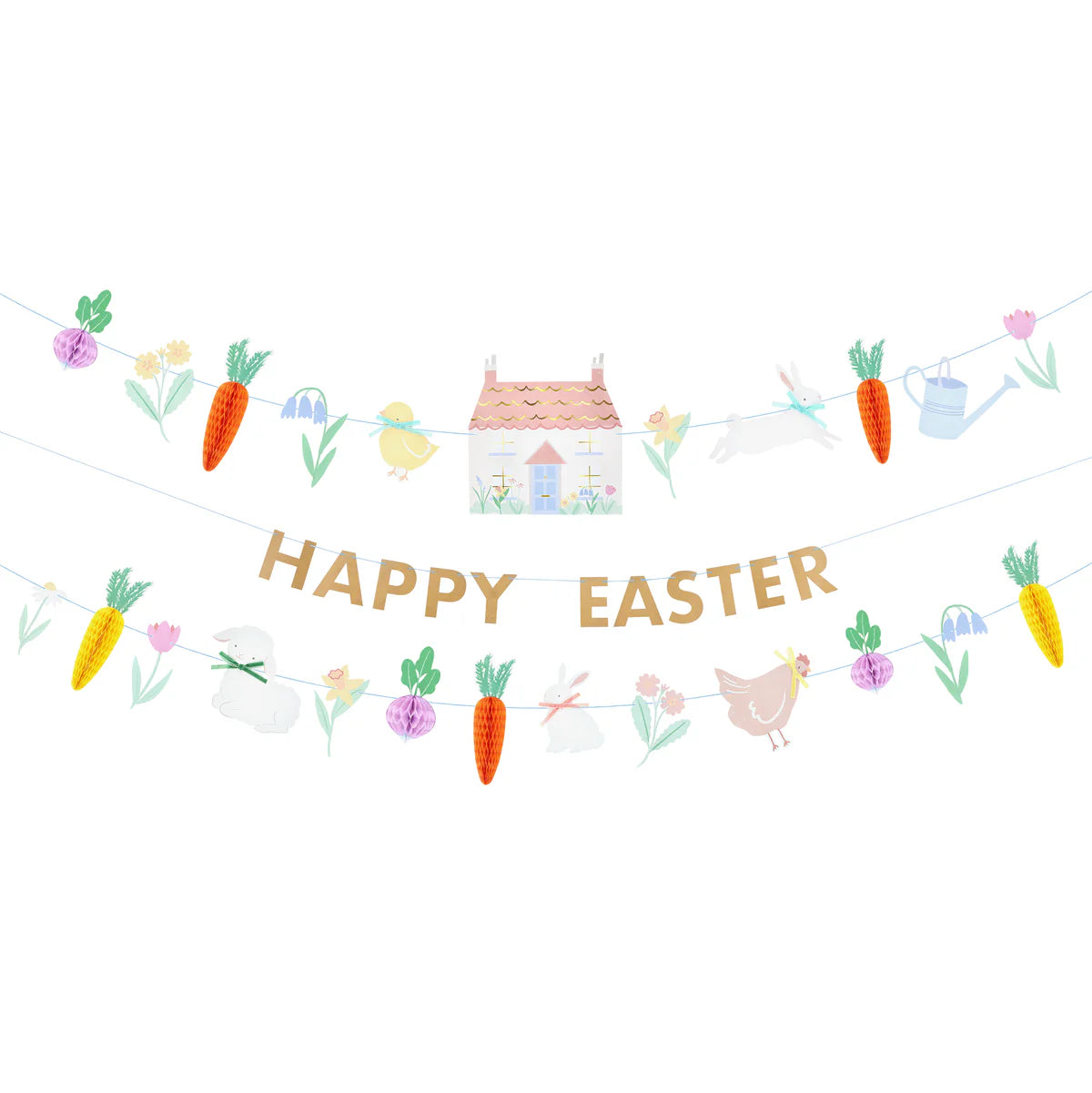 Adicione um toque de charme rústico às suas celebrações da Páscoa com este encantador conjunto de grinaldas de papel. Com cenouras e rabanetes em forma de favo de mel, inspira-se no charme despojado dos designs com temática vegetal. Decorado com flores primaveris e animais adoráveis, detalhes de laços de veludo e uma mensagem dourada brilhante de "Feliz Páscoa", transborda textura e alegria. O cordel azul facilita a pendurá-lo em janelas, portas, lareiras ou mesas. Com três fios separados, pode exibi-los juntos ou decorar cada um individualmente para um aspeto lúdico e em camadas. Além disso, é reutilizável: basta guardá-lo após a Páscoa e voltar a utilizá-lo ano após ano.