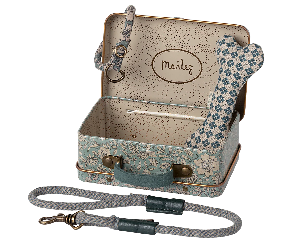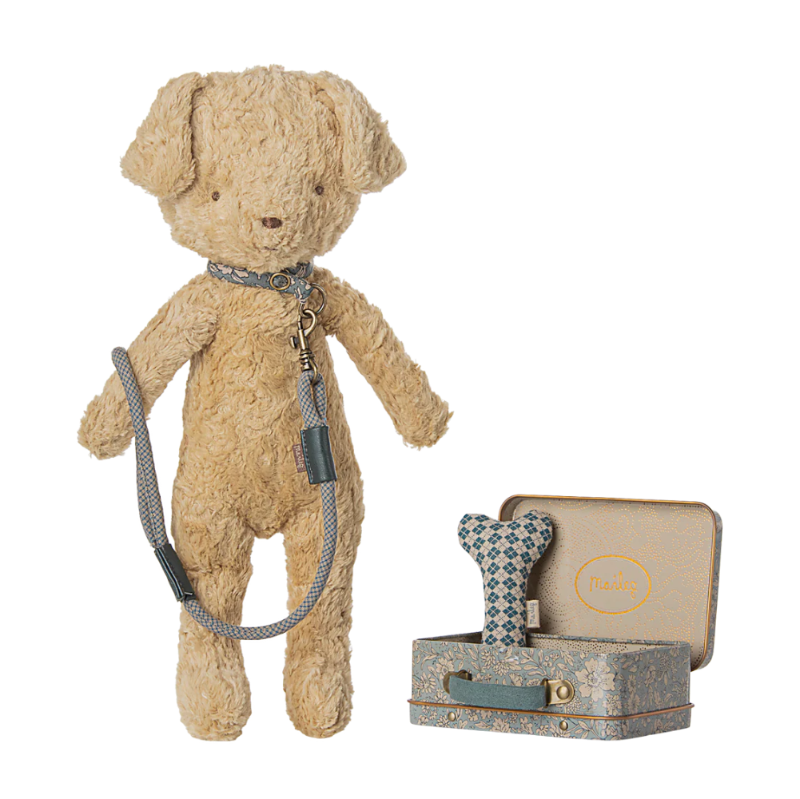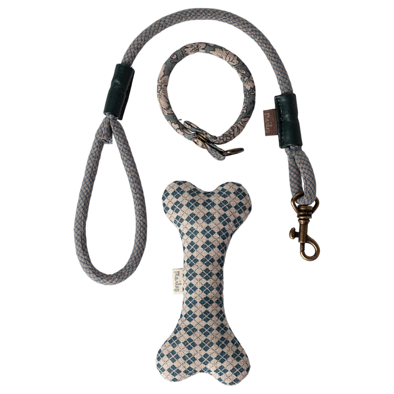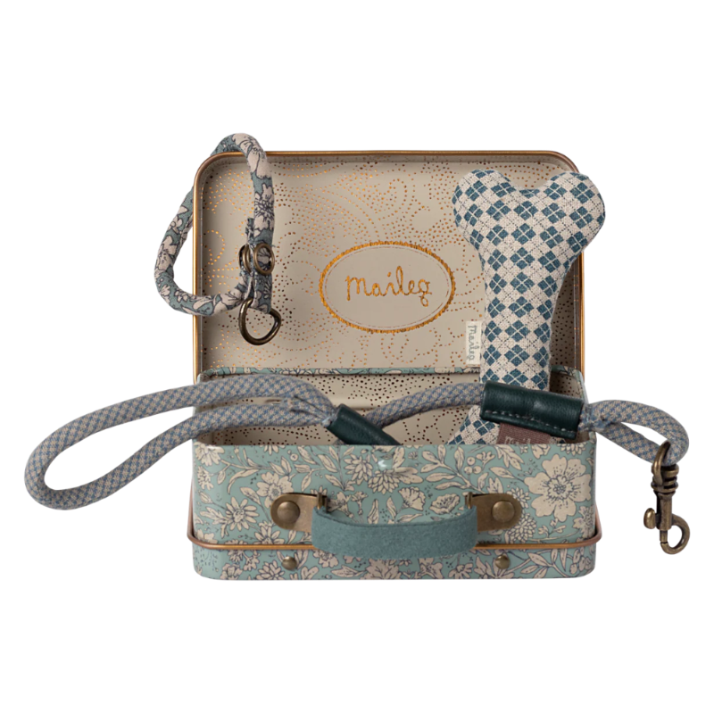 Este conjunto tem tudo o que o seu cãozinho de peluche precisa. Inclui um osso, coleira e trela, tudo cuidadosamente embalado numa caixa de metal com um estampado fofo da Maileg.