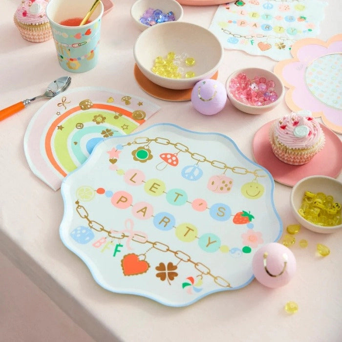Dê um toque especial à sua festa com estes pratos de papel premium. Cada prato apresenta um divertido padrão de charms em cores pastel muito moderno e divertido sobre um prato com fundo de arco-íris.