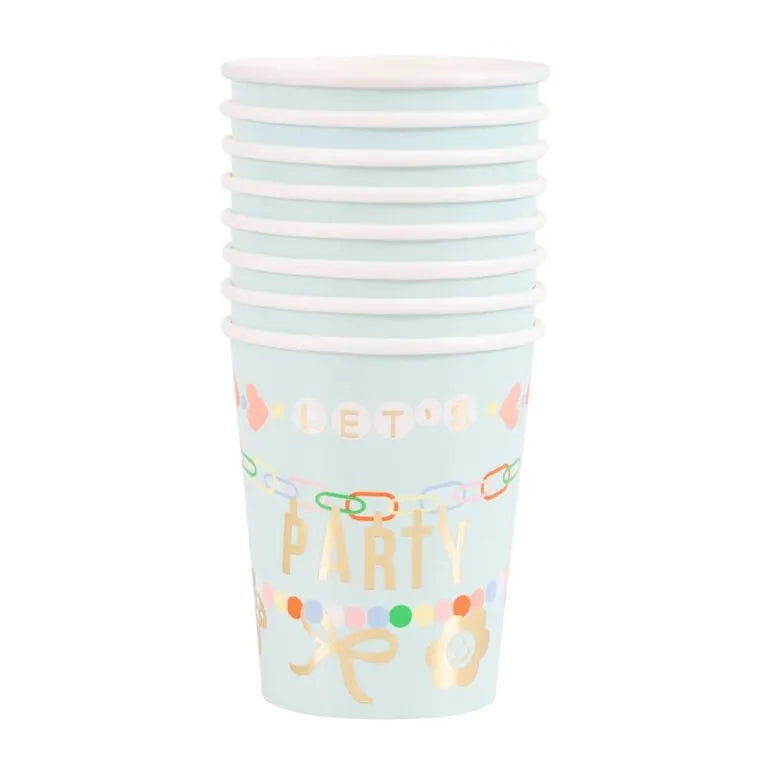 Estes copos de papel com estampado de amuletos sobre copo menta. Perfeitos para aniversários infantis com muita cor.