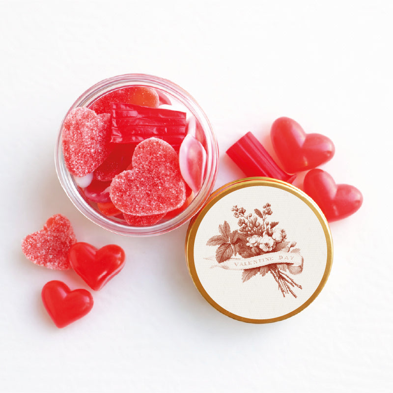 Cada bote de plástico grueso tiene una tapa de aluminio dorado con etiqueta "Valentine Day" rellenos de golosina de la mejor calidad fabricadas en España.