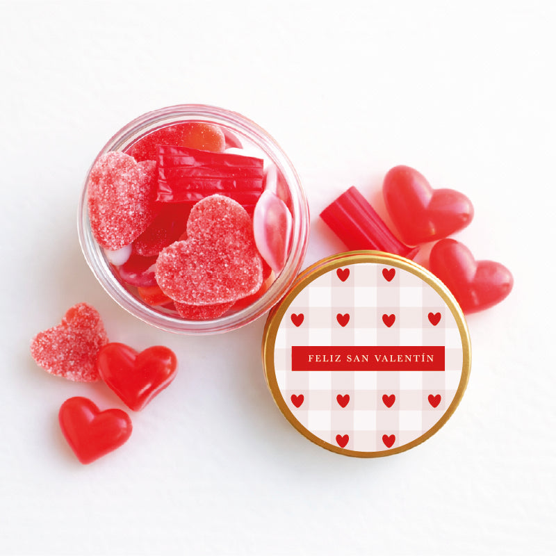 Cada bote de plástico grueso tiene una tapa de aluminio dorado con etiqueta en forma de carta de amor rellenos de golosina de la mejor calidad fabricadas en España.