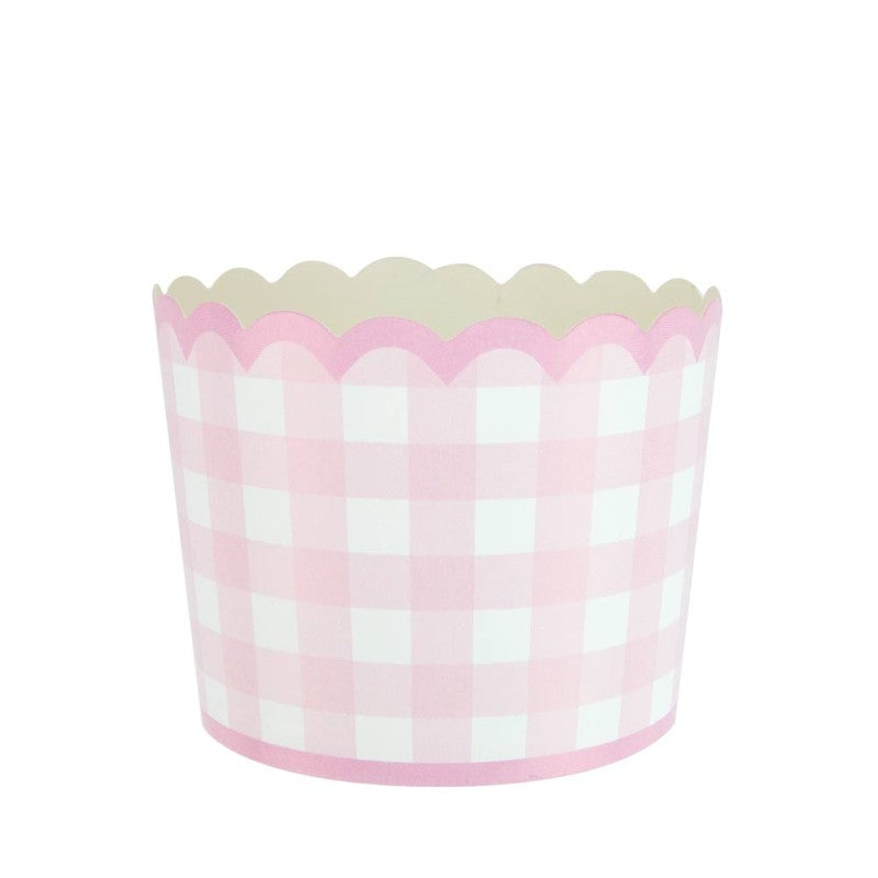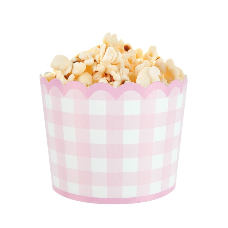 Bases de cartón con estampado vichy rosa y un elegante borde dorado festonado. Perfecto para colocar cupcakes, golosinas o palomitas.